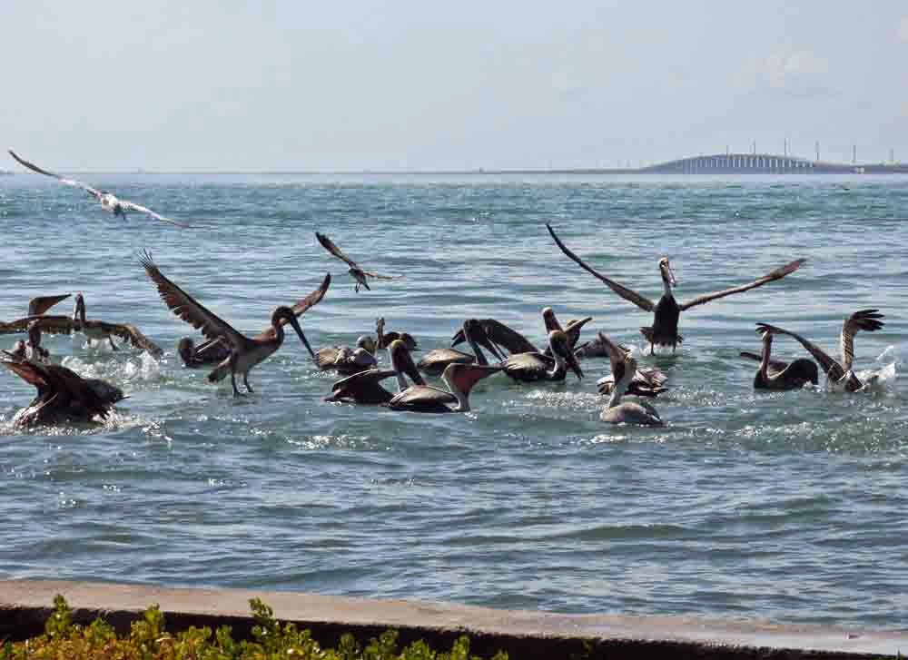 This year a huge group of pelicans was fishing right off the sea wall in front of us. They fished there all day. These are not the best pelican pictures you’ll see, but they are some of the best I’ve been able to get. I hope you like them.