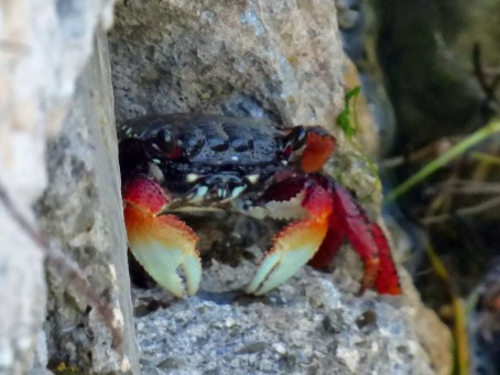 We got veggie wraps at Publix and took them to Sombrero Beach. It was very crowded and we were lucky to find a parking place. Then we were lucky to find a picnic table. A large iguana walked past us and into the tall grass on the beach side of the fence. Then a young, bright green one came out of the tall grass to munch on the lawn. I made kissing sounds to get him to look at me.