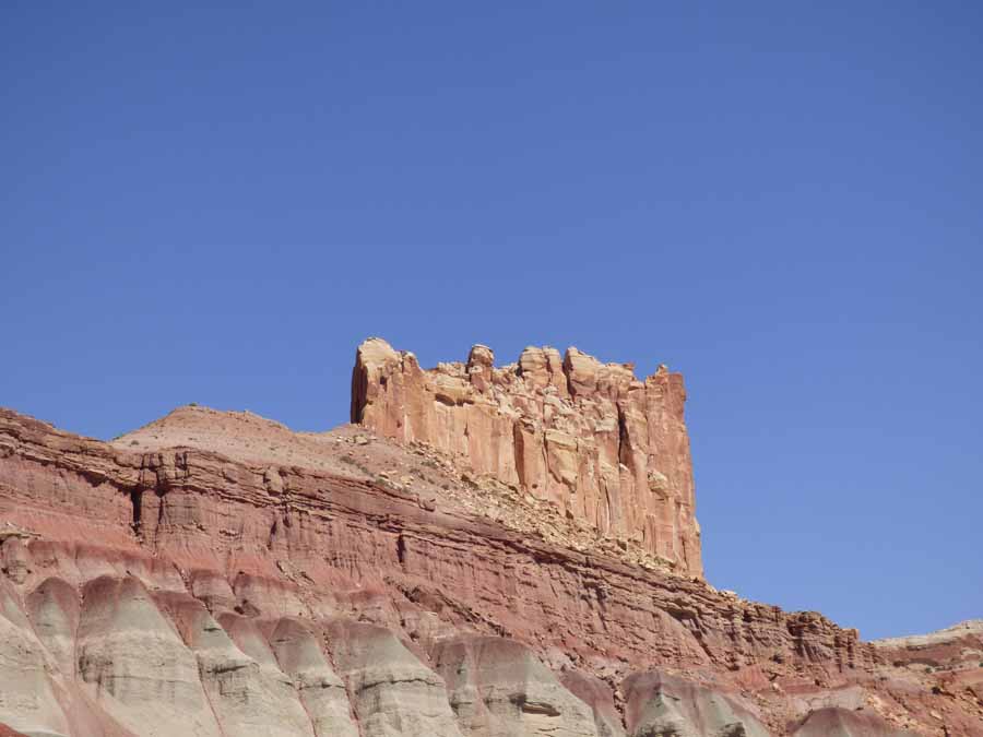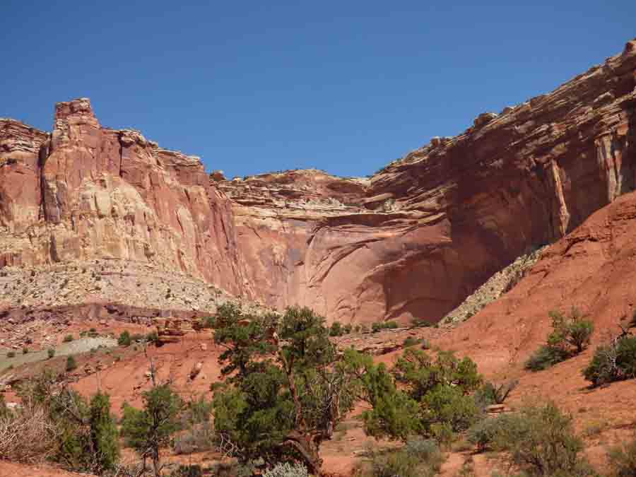 The name of the park, Capitol Reef is from two sources. Capitol is for the white sandstone dome that reminded early travelers of the U.S. capitol building. The Reef comes from the wall of rock along the fold, which was a barrier “reef” to early travelers.
