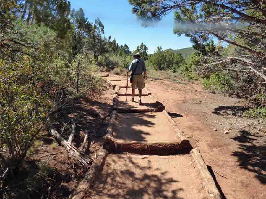The end of the road was only five miles in.  That surprised me as the Kolob Terrace road is so much longer. We took the overlook trail, which was a bit rougher than Andy’s sense of balance likes.  He did very well anyway. This was an easy section, a walkway like I’ve never seen before. It was a series of raised beds made from logs and dirt.  That way, water could run between them and on down the mountain.