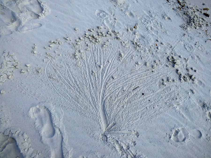 Maybe it was because we were on a relatively undisturbed part of the beach and well above the tide and wave line, that I saw some amazing new sights. There were many, many crab holes in the sand. A number of them had little piles of sand balls the crabs had pushed out making their homes. This one was on a bit of a slope and the little wet balls of sand rolled in different directions. It looks like art.