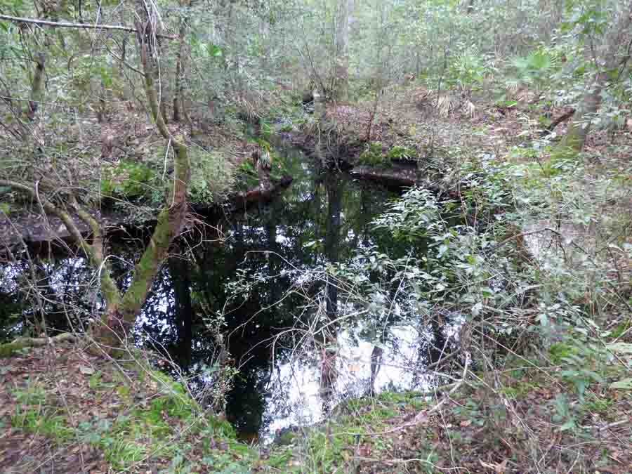 I saw a round black pond upstream a bit and went to see if it was a spring where the creek originated. When I got there, I could see the creek coming in from the far side.