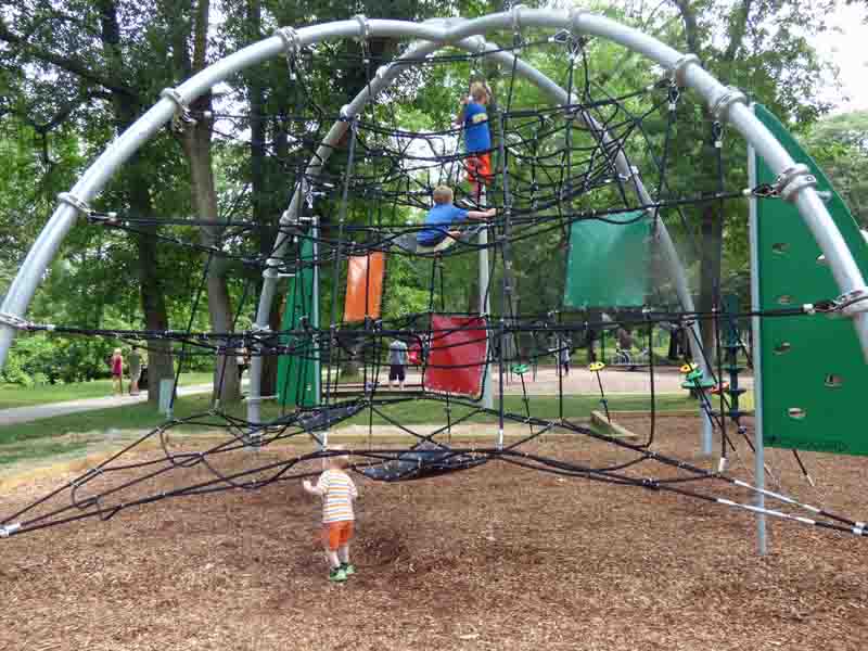 We also take the boys to Cedar Creek Park in Cedarburg. This is their favorite park because it has a piece of playground equipment that looks like a fire truck. The park has a new piece of playground equipment this year. Owen carefully climbed near the top. He is the one with his back to the camera. Cam managed to climb onto the first nest at the bottom.