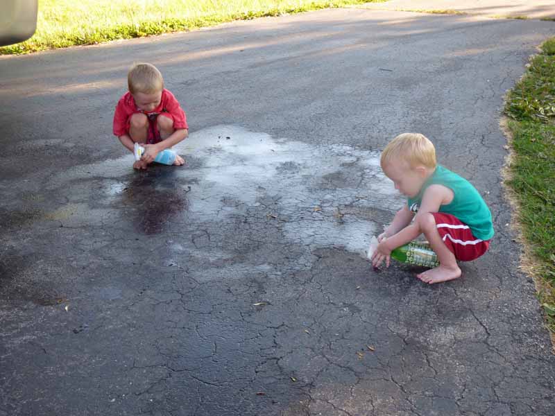 The boys filled some spray bottles with water from a downspout barrel. They spent a lot of time spraying the driveway with water, making pictures and “roads”, as well as other things I could not identify.