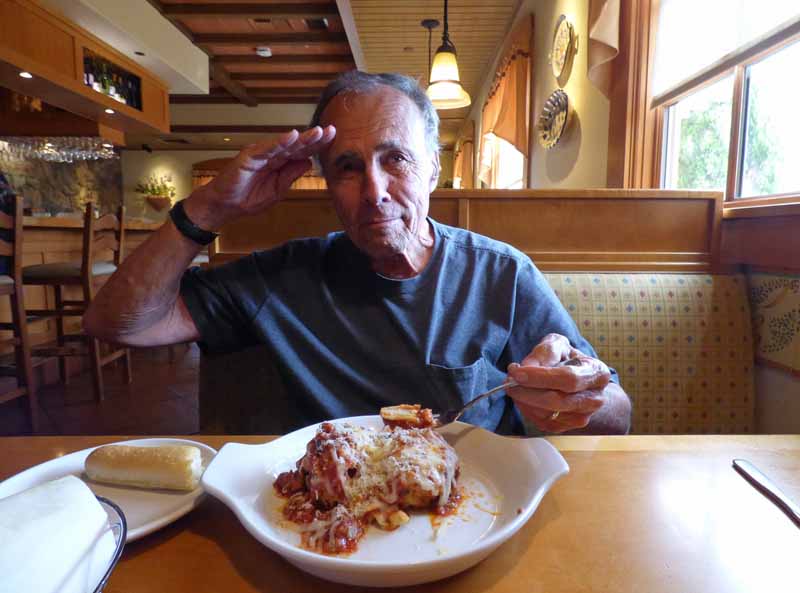 The Olive Garden restaurant offers a free meal to veterans every year and Andy loves to eat there. Who can pass on a free meal? Here he is anxiously awaiting his food.