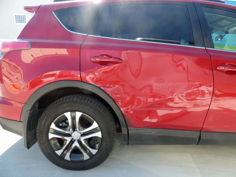 Notice the rear tire.  I can’t decide if the other guy’s tire rubbed paint off our wheel, or whether those black marks are the rubber from his tires.