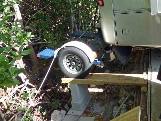 This morning, we sat out back on our patio overlooking the mangroves drinking our coffee, as usual. As a reminder, here is our towing dolly, on a rack behind the motor home. It is tucked neatly out of our way for the winter.