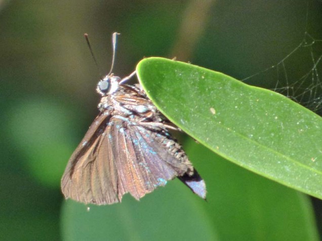 This moth landed on a mangrove leaf and rested for a while. This is a black mangrove leaf. Black mangroves are very interesting. They grow in the tide zone and are sometimes in the water and sometimes on dry land. That is salt water here on the ocean. They suck up the salt with the water and, later, extrude in on the backsides of the leaves. Here, you can see the salt on the top of the leaf. It is very salty, like a potato chip. When we gave nature tours at Crane Point (here in Marathon), we would have the tourists pick a leaf and lick it. They were always surprised at the saltiness.