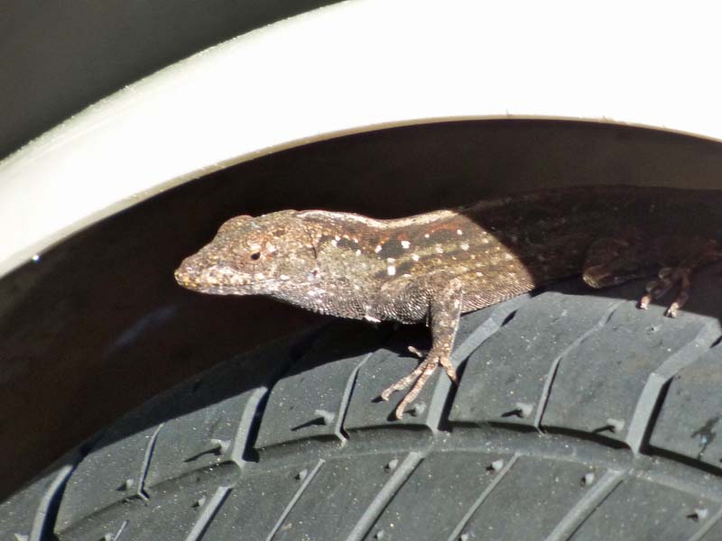 On closer inspection, you can see this lizard sitting on the tire. We don’t know our lizards well enough to name them but think it is the same one every time. It seems like a nice, safe place to hide out. So, Andy has named him Louie. Then, after a few more minutes, Andy noted that “When we leave, Louie will have to retire”.
