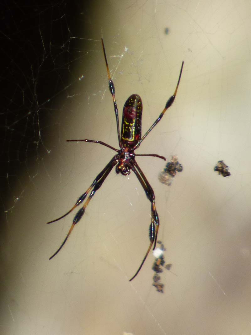 We noticed this very small spider in the mangroves. I think it is a male orb weaver as the female is very large. This is its belly.