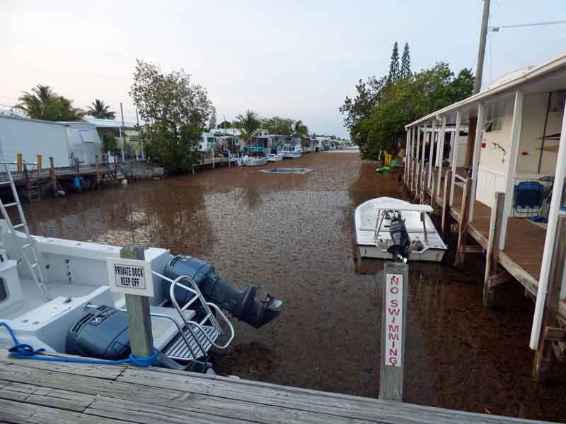 Those barriers and bubblers at the entrance to the canal are ugly, but they usually do a good job. Here, you can see the sea grass that has collected on the outside of both barriers.