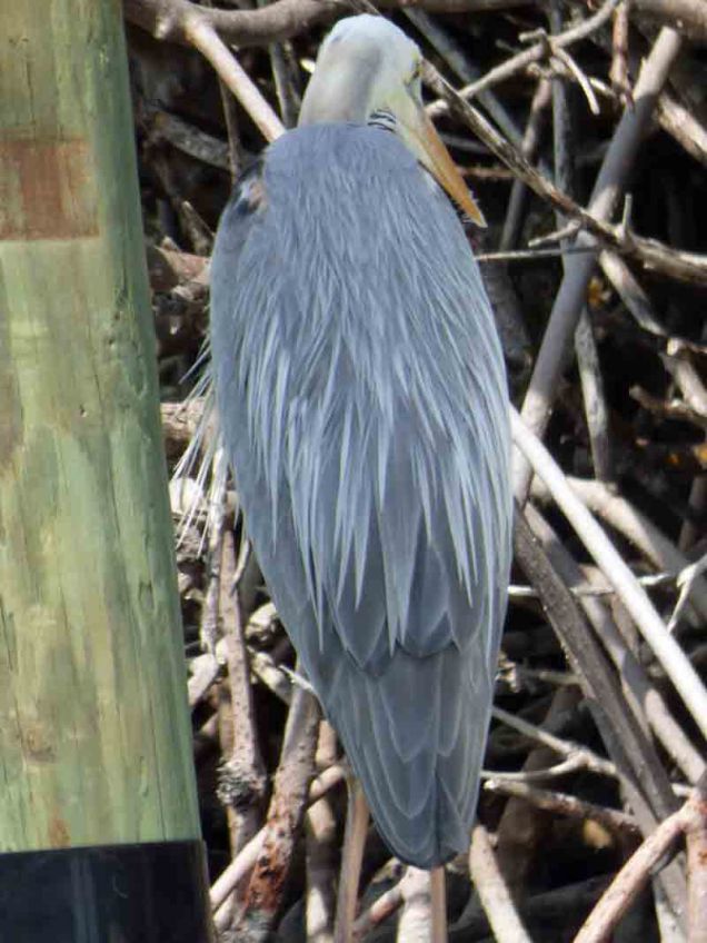 This great blue heron was on the pier across the canal from us. It stayed there almost the whole time we sat at the waterfront but always had its head behind the piling or its butt facing me. So, it was a chance to add to my collection of bird-butt photos. The feather pattern is beautiful.