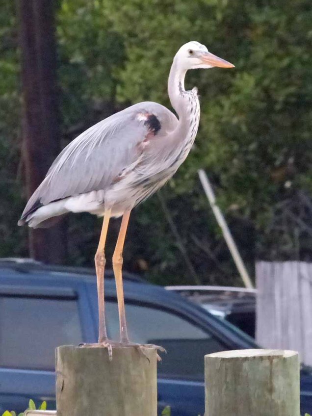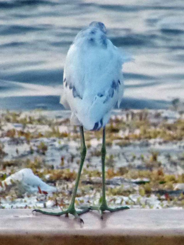 This smaller heron was standing on the barrier with its back to us. I’m pretty sure it is a juvenile little blue heron. Another bird butt for my collection.