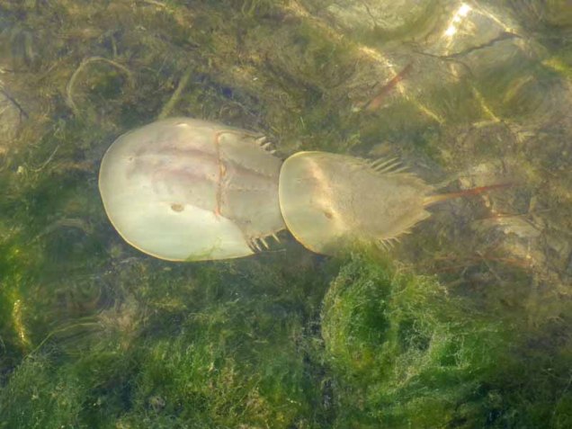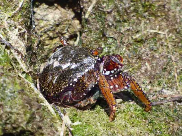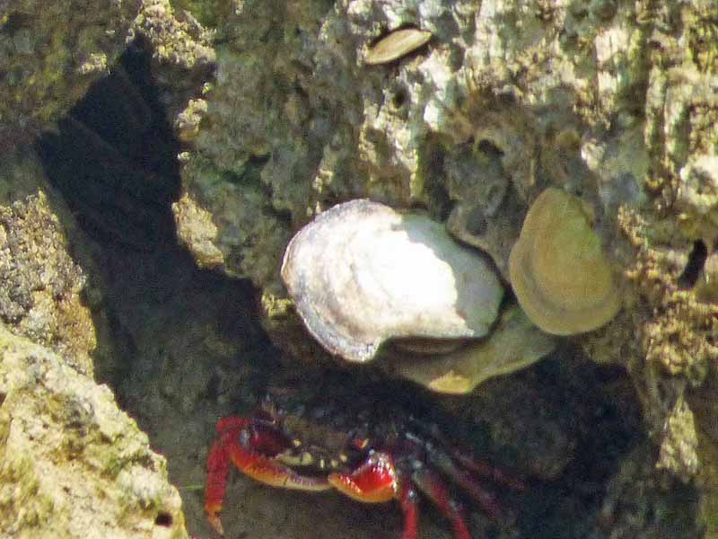 I zoomed in on the shells embedded in the limestone across the canal and did not notice this little crab underneath until I got the photo on the computer. Better focus would have made a better photo, again.