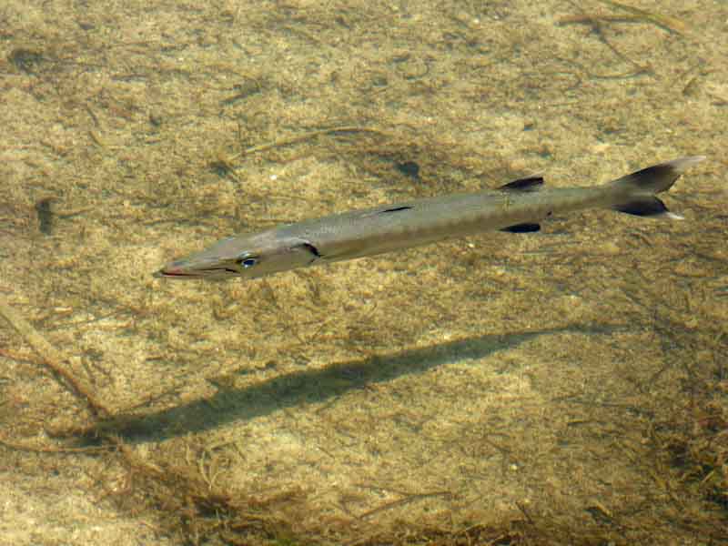 A small barracuda was hanging in the canal. We thought it was eyeing some minnows nearby, but it did not pay attention to them when they swam close.