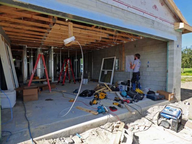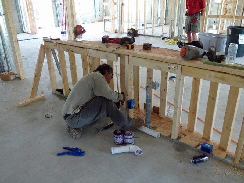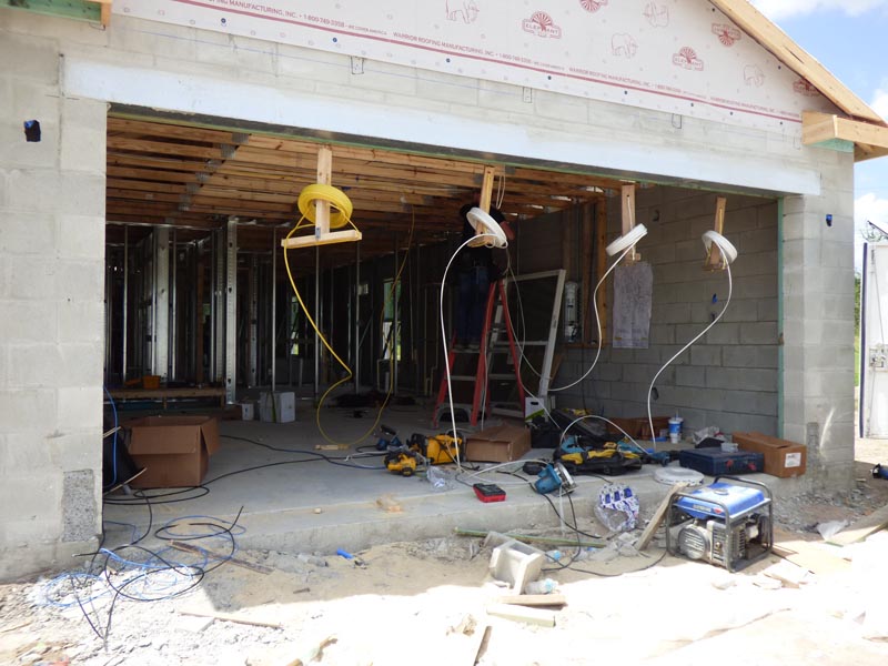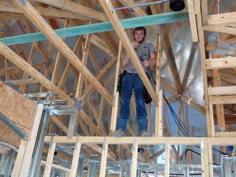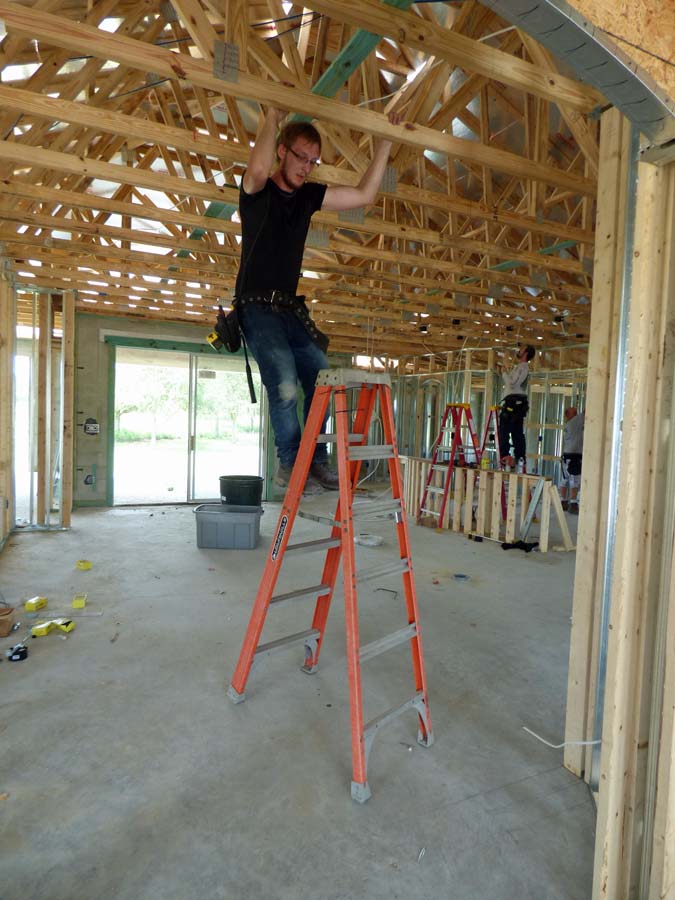 We were so impressed with the carpenters using stilts yesterday.  Well, let me tell you, electricians don’t need no stinkin’ stilts.  They walked around on their ladders.  It takes some fancy hip action to do so. This guy was walking across the room.  When they moved a short distance they did not hold on to the ceiling joists.