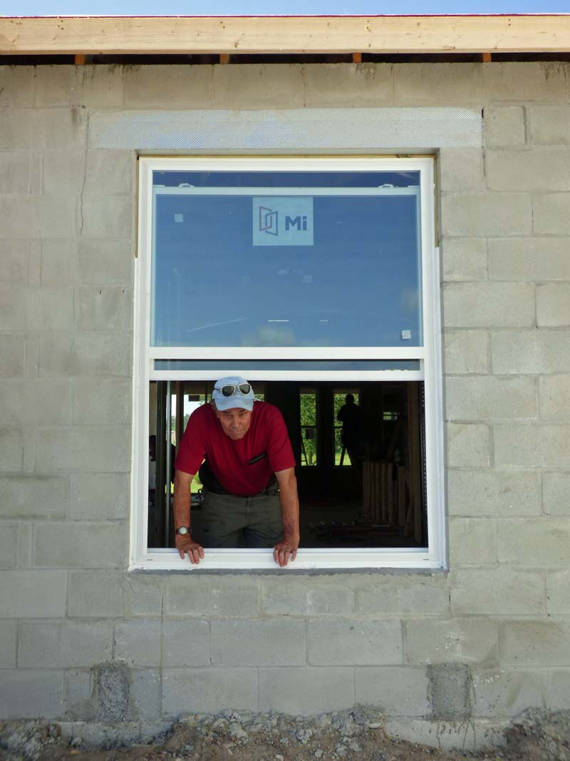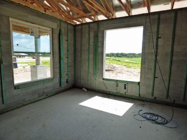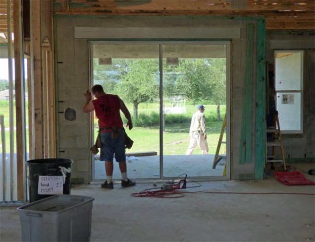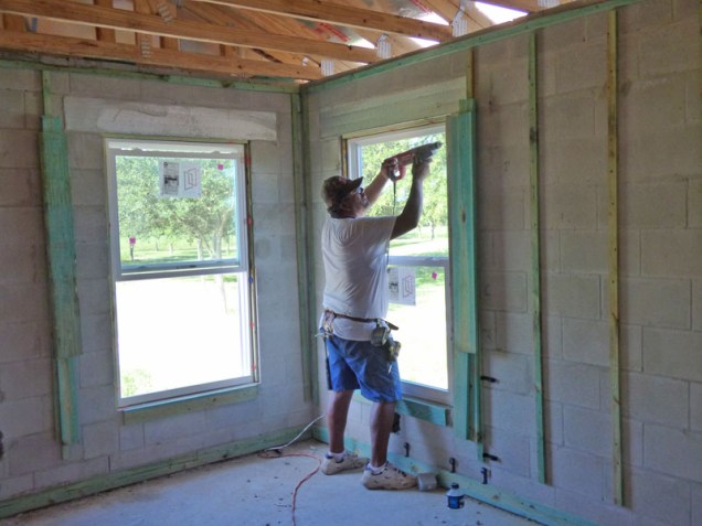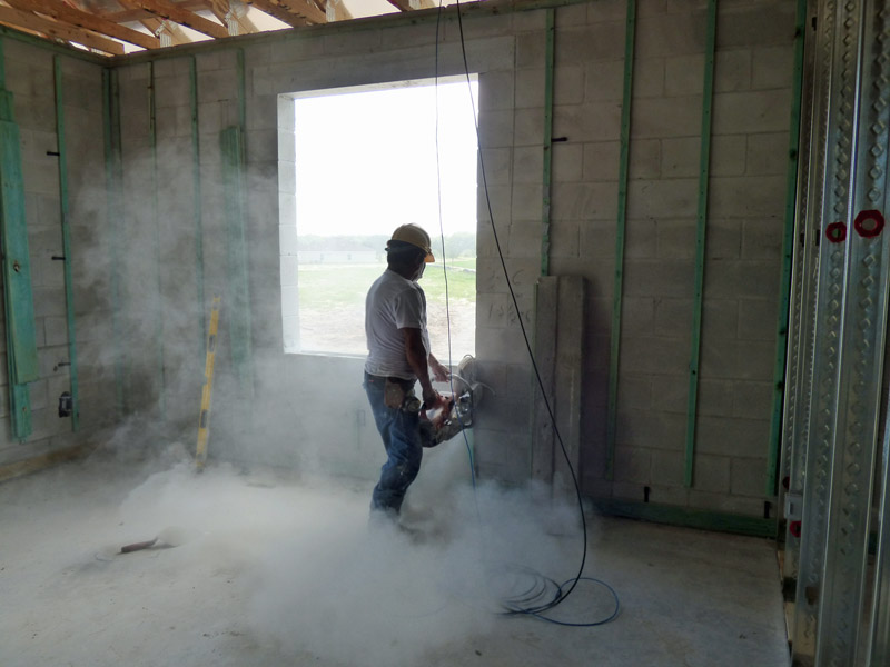 I had noticed that one of the living room windows was smaller than the other. The original plans called for a smaller window in the right corner.  I thought that looked strange and asked to have two windows placed on that wall. The man we met with said how about a large one centered.  I agreed.  The hole was large, but not the same size as the front window. I wished I had clarified that or paid closer attention. This morning, I noticed that all the windows had been installed except that living room window.  Then a man came in with a humongous, scary saw.  He marked lines under the window and sawed away at the block wall.  Then, he went outside and cut from there.  Another, younger man walked over and asked if he was ready for the blocks to be kicked.  Then he kicked them outside.