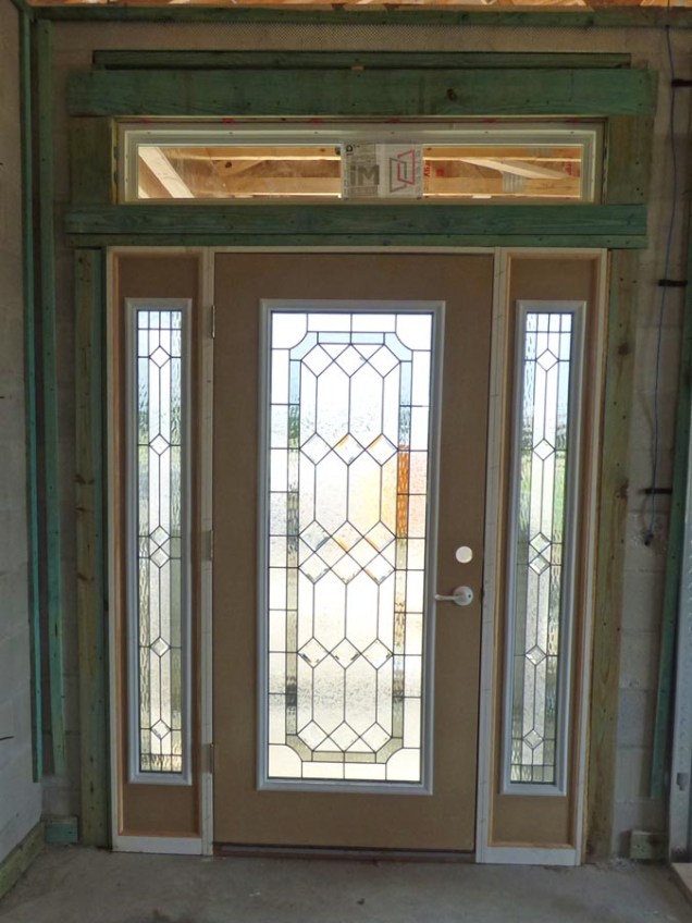 I was thrilled when two young men installed the front door.  I chose it from a photo and it turned out to be beautiful. There is no color to it.  The color is from what is outside. Ah yes, I can pick out the dumpster and the port-o-potty.