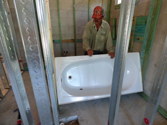 We watched a plumber install a bathtub.  He really had to wrestle with it to slide it into its place.