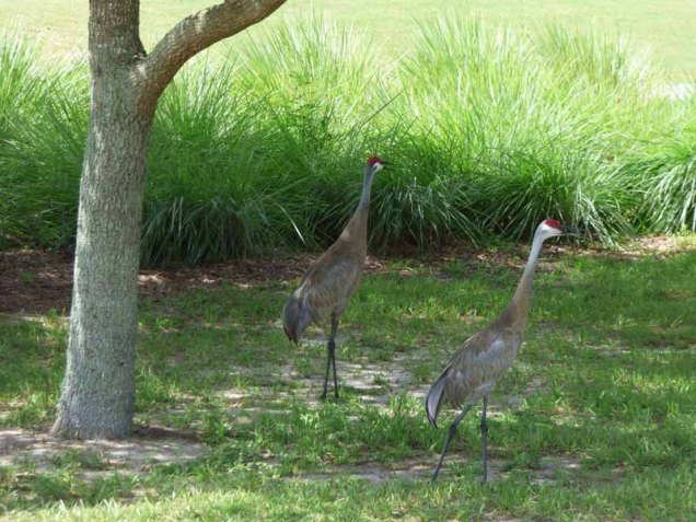 With all the noise emanating from the house, two sandhill cranes walked into the shade of the trees behind the house.  They were cautious and tilted their heads listening.
