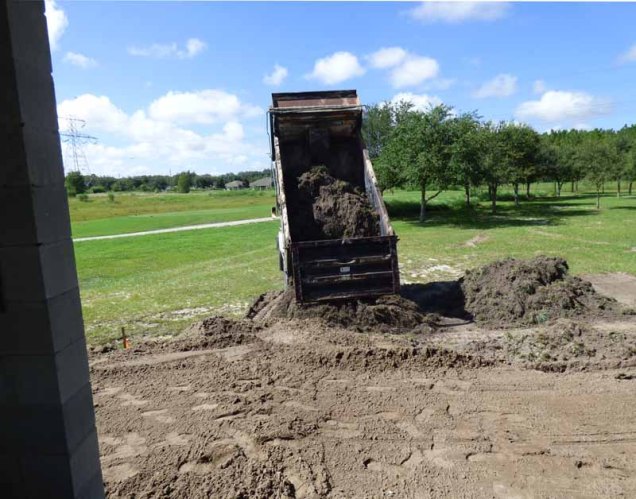 Then a dump truck came around the corner with more dirt. They are building up the level of ground behind the house so they can pour a patio back there for the “bird-cage” screen room. He assured me that it will have a nice slope away from the house and there will be room for a flower bed.