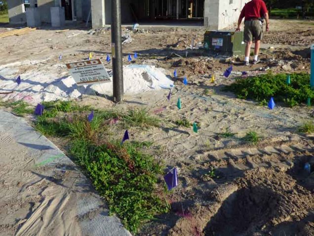The City of Leesburg was here today too. This little forest of flags is marking electric, water, sewer, gas, and “reuse” (?) lines. All the utilities are located on the garage side of the homes in the development. So our neighbor on the garage side will have their garage next to ours. The neighbor on the front porch side will have their garage on the far side from us. So, utilities run in between every other house.