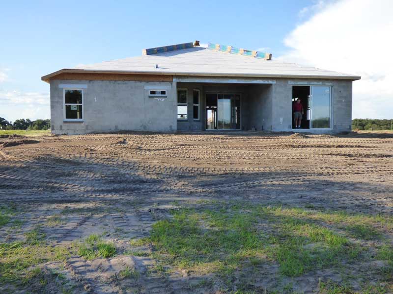 Then a dump truck came around the corner with more dirt. They are building up the level of ground behind the house so they can pour a patio back there for the “bird-cage” screen room. He assured me that it will have a nice slope away from the house and there will be room for a flower bed.