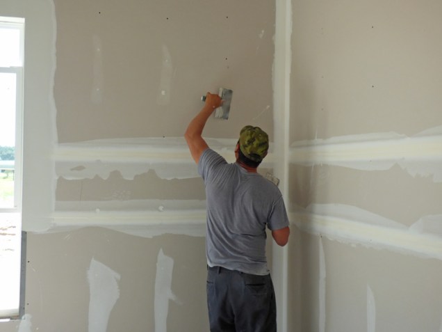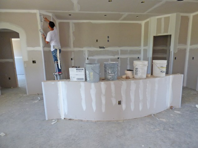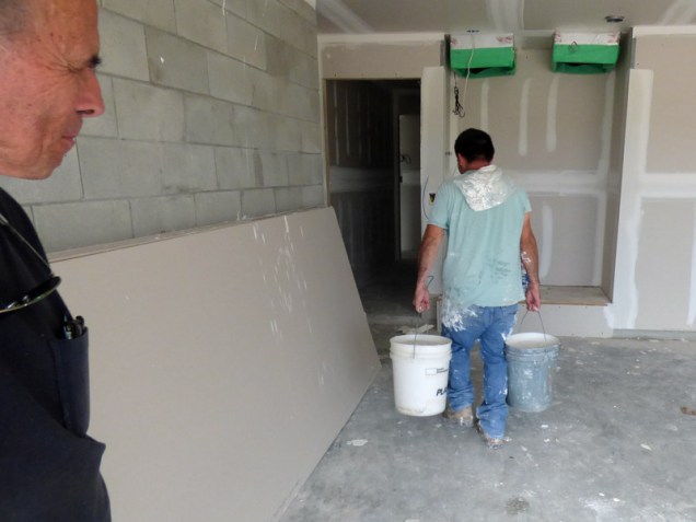 The Mud Slinger was mixing his mud in the garage.  That huge collection of joint compound boxes had a pre-mixed compound in them.  He poured huge globs of it into two five-gallon buckets. It was very thick, like paste or bread dough. That gray bucket has huge a mixer beater in it. He added a cup of water to the mix.