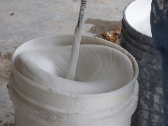 Then he attached his heavy-duty drill to the beater and began to stir. This stuff was so thick that the bucket danced around a bit. It took a good bit of mixing to get the right consistency.