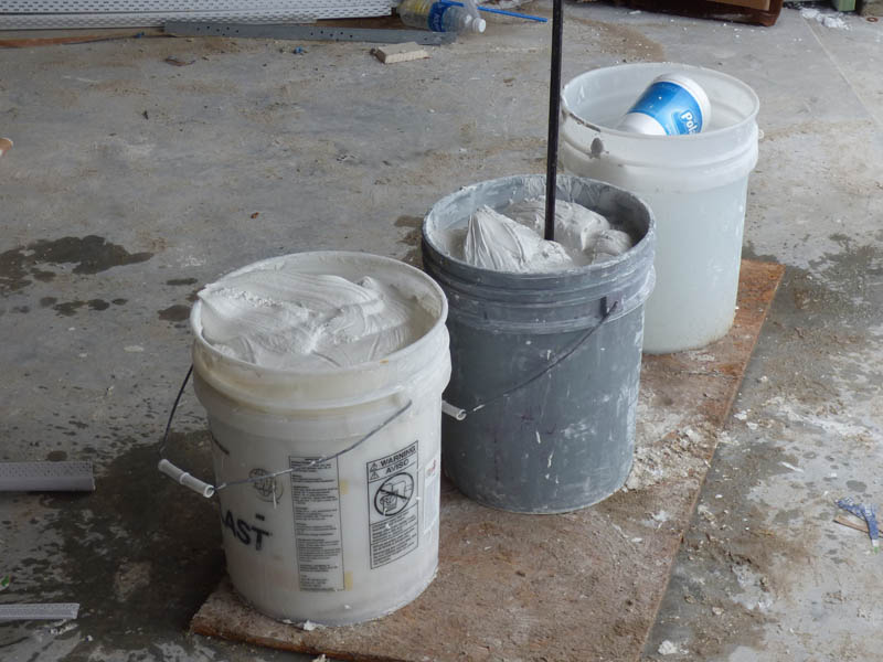 The Mud Slinger was mixing his mud in the garage.  That huge collection of joint compound boxes had a pre-mixed compound in them.  He poured huge globs of it into two five-gallon buckets. It was very thick, like paste or bread dough. That gray bucket has huge a mixer beater in it. He added a cup of water to the mix.