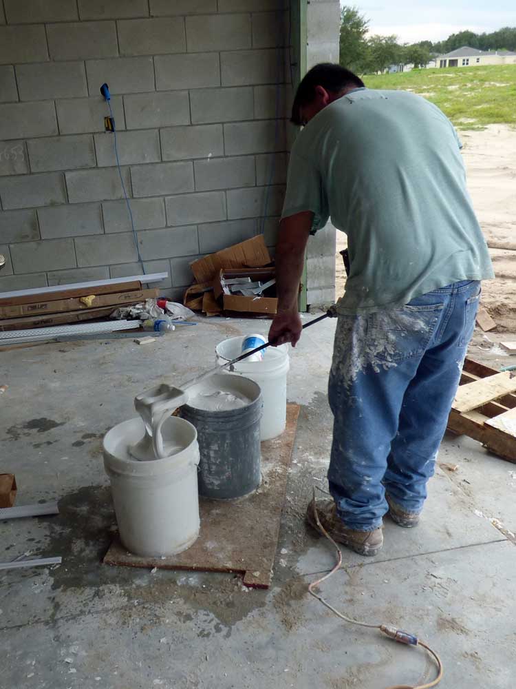 Then he attached his heavy-duty drill to the beater and began to stir. This stuff was so thick that the bucket danced around a bit. It took a good bit of mixing to get the right consistency.