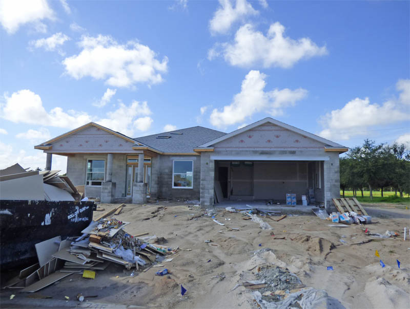 We went inside to see if anything had changed. The Mud Slinger had left a bit of trash on the floors, as well as hundreds of dollops of joint compound. We watched some golfers tee off. I heard a noise and went to the front of the house to see a new dumpster delivered and the overflowing one towed away. We went back to the motorhome.
