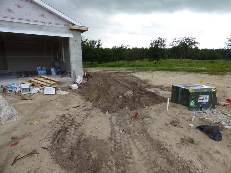 I noticed a change. A pile of trash had been moved over and a load of dirt had been spread on the garage side of the house, by the utility connections.