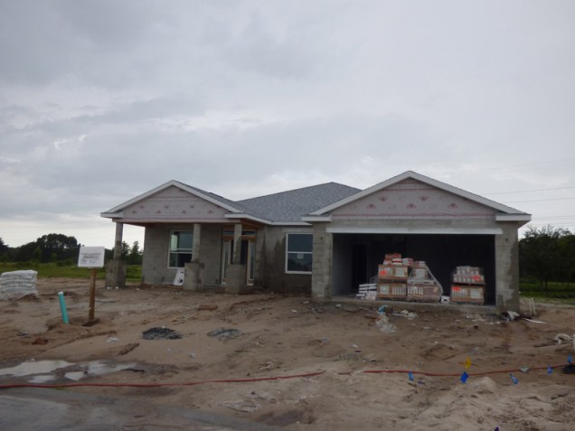 We didn’t stay long since it was lunch time.  Then, we returned around 5:30 to see what had been done.  The man was still there. He had covered almost the entire house with those rolls of what I called underlayment in the garage tile pile. He was talking on the phone while we looked around.  I told Andy I thought it was Russian, or at least something close to it.