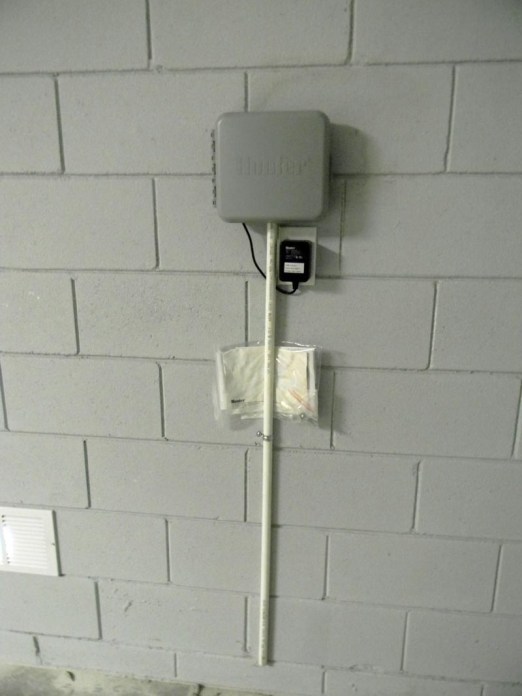 We solved the mystery of a small PVC pipe sticking out of the outside wall of the garage. This is the irrigation system controller on the wall.