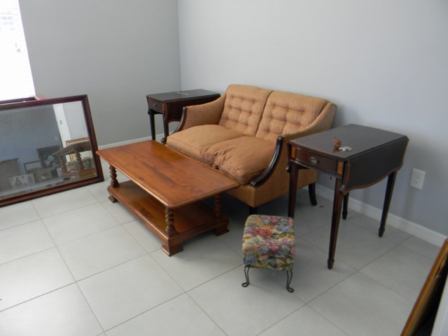 The family room furniture looks pretty good in the new family room. It held up fairly well in storage but is a bit dusty and slightly musty. The cushions were somewhat squashed by things piled on top of them, but I think they will survive. I’ll have them cleaned after the next load arrives so I can get it all done at once.