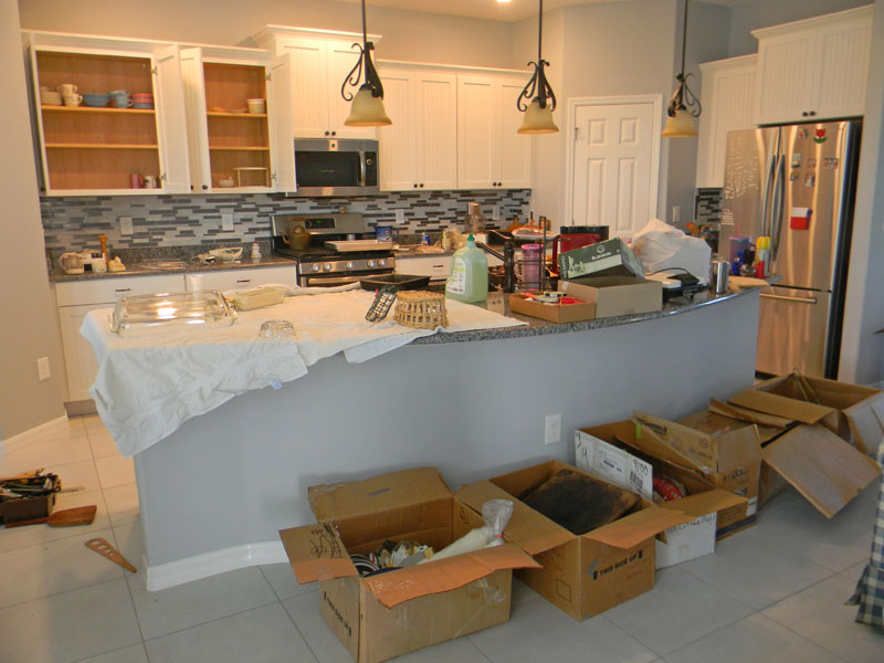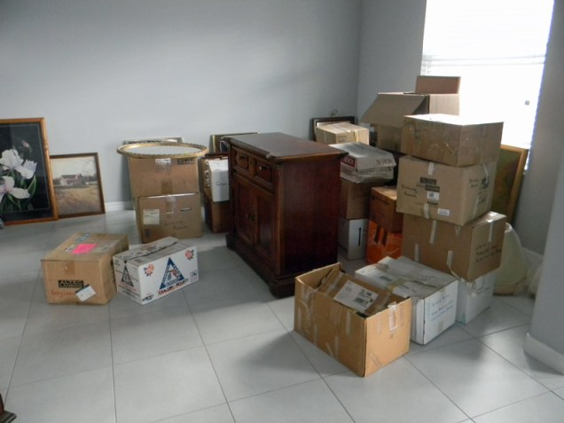 There were so many boxes and pictures in the dining room that I didn’t know how we would get the furniture in. Tom rearranged it later to make room for the table and china cabinet.
