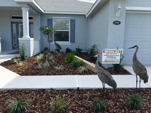 When we drove back to the house in the morning we could see that the Cranes had moved into 3737. Four of them were in the nook between the front door and the garage. They did not leave when Tom got close to take pictures or when Andy unlocked the front door.