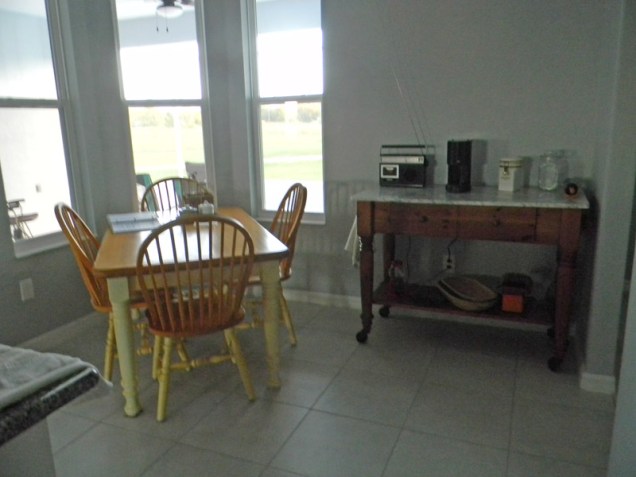 and also spacious approaching from the kitchen side of the counter. We can move it out if we need to seat more than three, but it is very heavy. The marble-topped cart is still unobstructed. It is a little unorthodox and the table is not centered under the light fixture. I’ll live with it a while and see how I like it. Andy is delighted with it; he has a great view of the fourteenth tee from his seat.