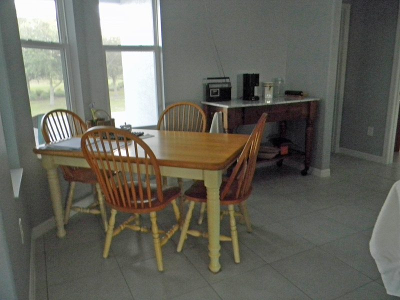 and also spacious approaching from the kitchen side of the counter. We can move it out if we need to seat more than three, but it is very heavy. The marble-topped cart is still unobstructed. It is a little unorthodox and the table is not centered under the light fixture. I’ll live with it a while and see how I like it. Andy is delighted with it; he has a great view of the fourteenth tee from his seat.
