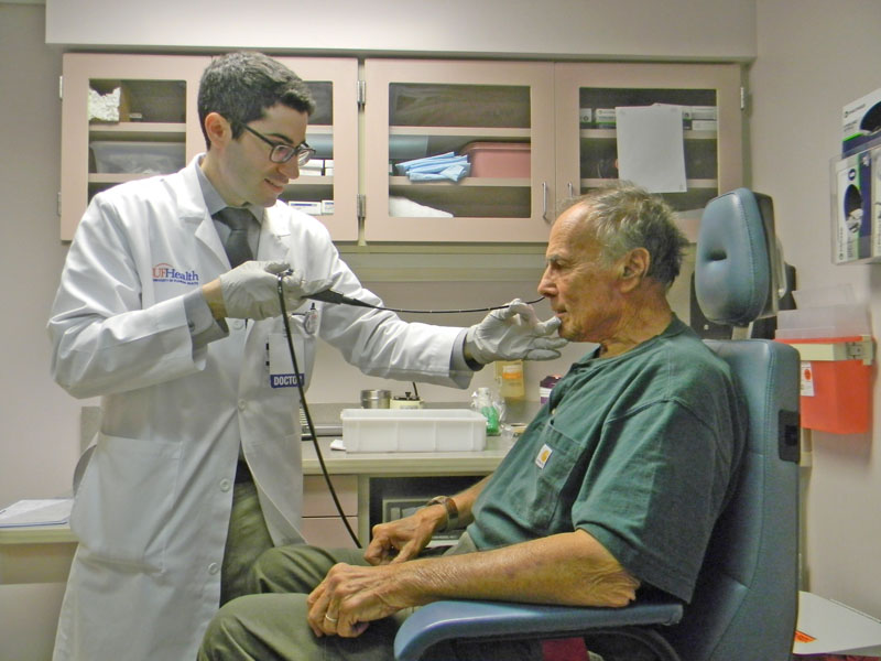He hates that hose the worst. Dr. Mendenhall arrived with a post-doc for the examination. First, he felt Andy’s neck.
