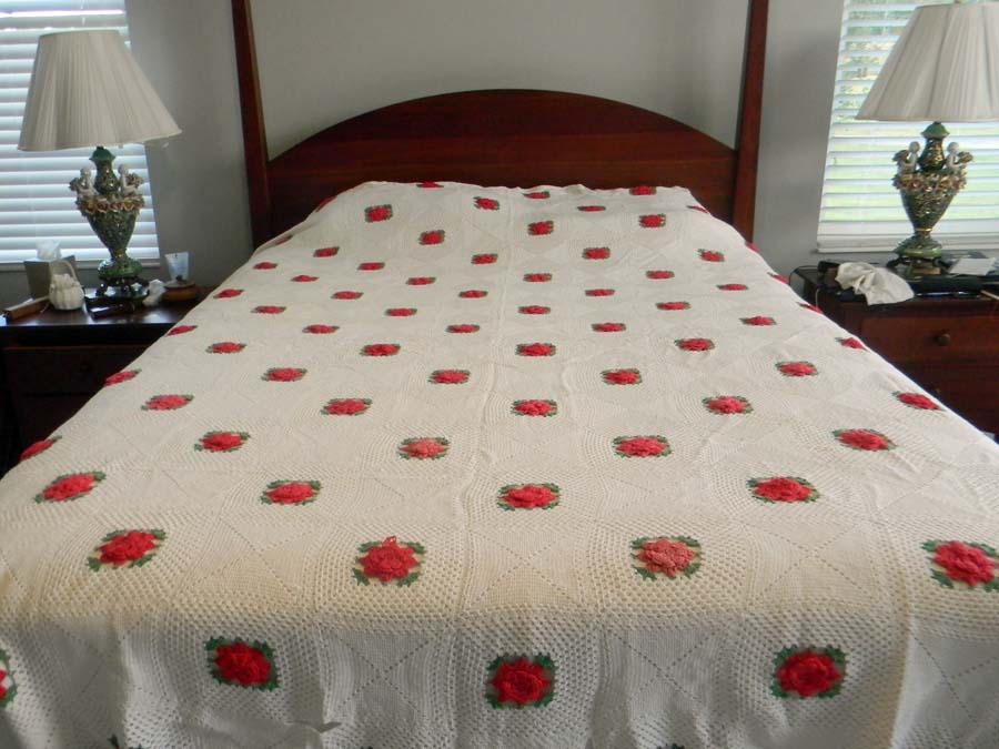 Sometime in the 1990s, I bought a new bed and Mama gave me the Rose-Bower crocheted bedspread to put on it. I was nearly fifty years old when I got my bedspread. Then, when we sold our house and moved on the boat, I took the bedspread back to my mother’s house for safekeeping. Later still, when Mama put her house up for sale, we took our possessions we had stored there and put them in a rented storage unit. We had furniture and household goods scattered among family and friends and moved things around several times during our boating life. I lost track of the bedspread.