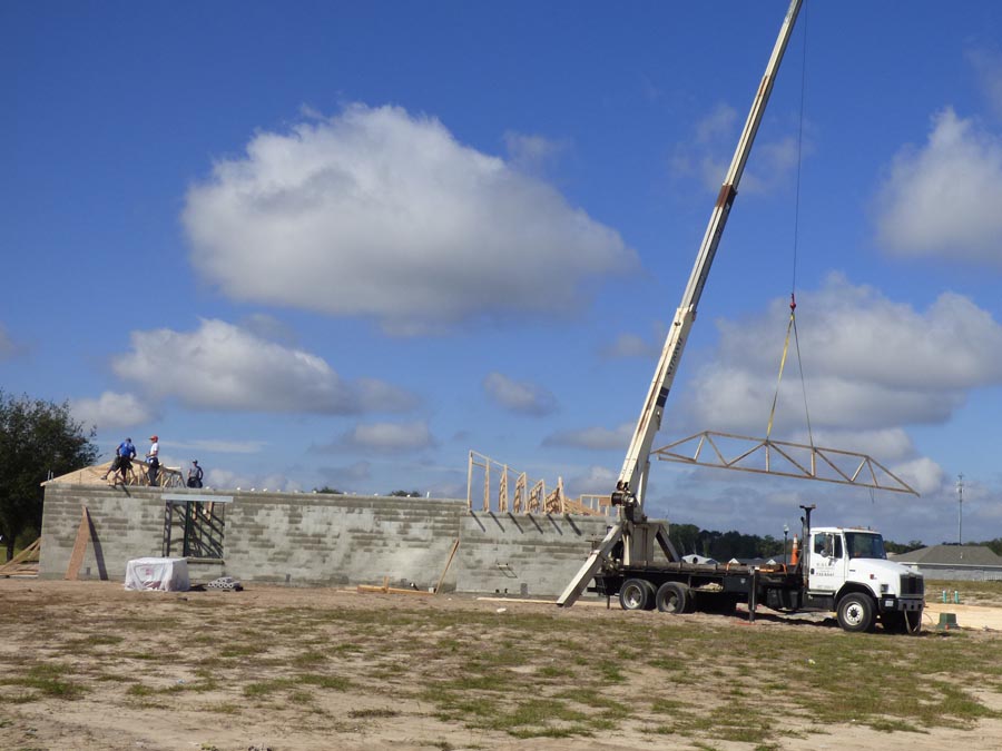 It goes really fast. The crew on top of the house has the trusses secured before the man offloading the truck can get the next truss up there with the crane.