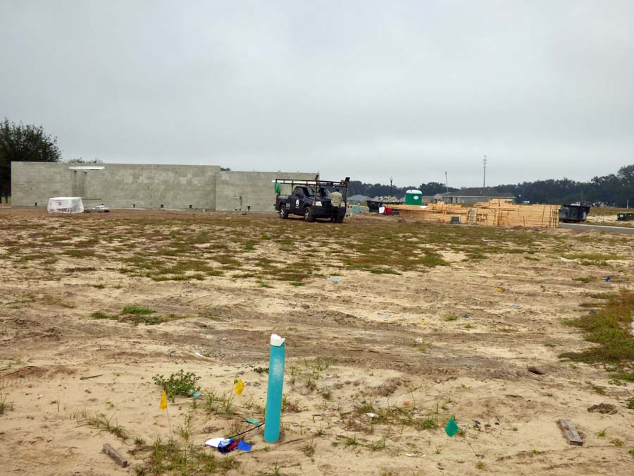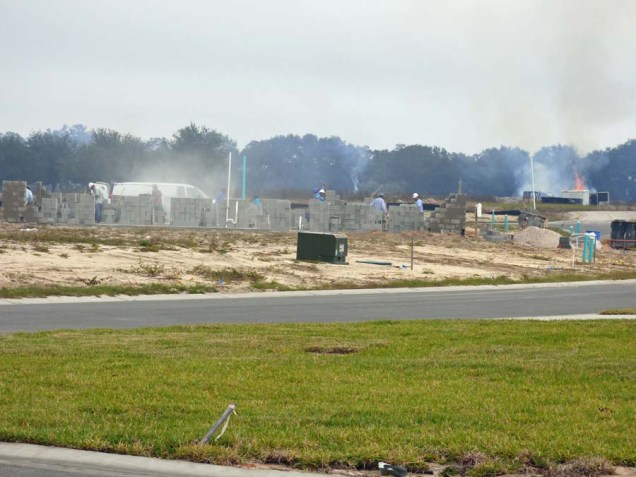 This is the house down the street past our house and across the street. This is the first day of block laying. They finish that job on the second day. You can see a fire in the background. They are clearing and grading the area beyond the end of the street for more houses.
