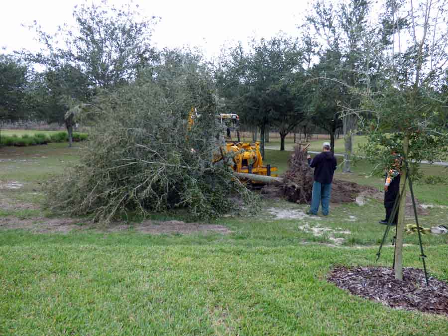 We saw a tractor dragging a tree on the golf course. I went out to investigate. It was apparently leaning too far toward another house on the golf course. Instead of simply cutting it down, they decided to move it next to our house, in the spot where another tree had succumbed to the hurricane.