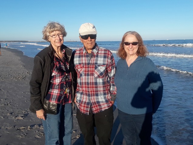 My sister Barbara flew down from Maryland, thinking she would soak up some of our Florida sunshine and warmth between school semesters. Wrong. She brought the cold with her. We picked her up at the Orlando airport on December 31. One of the things she said she wanted to do was go to the beach so we drove immediately to Port Canaveral since we were already part way there. We ate lunch overlooking the cruise ships. Then we took a nice walk along the cold, windy Atlantic Ocean. Someone offered to take our picture.