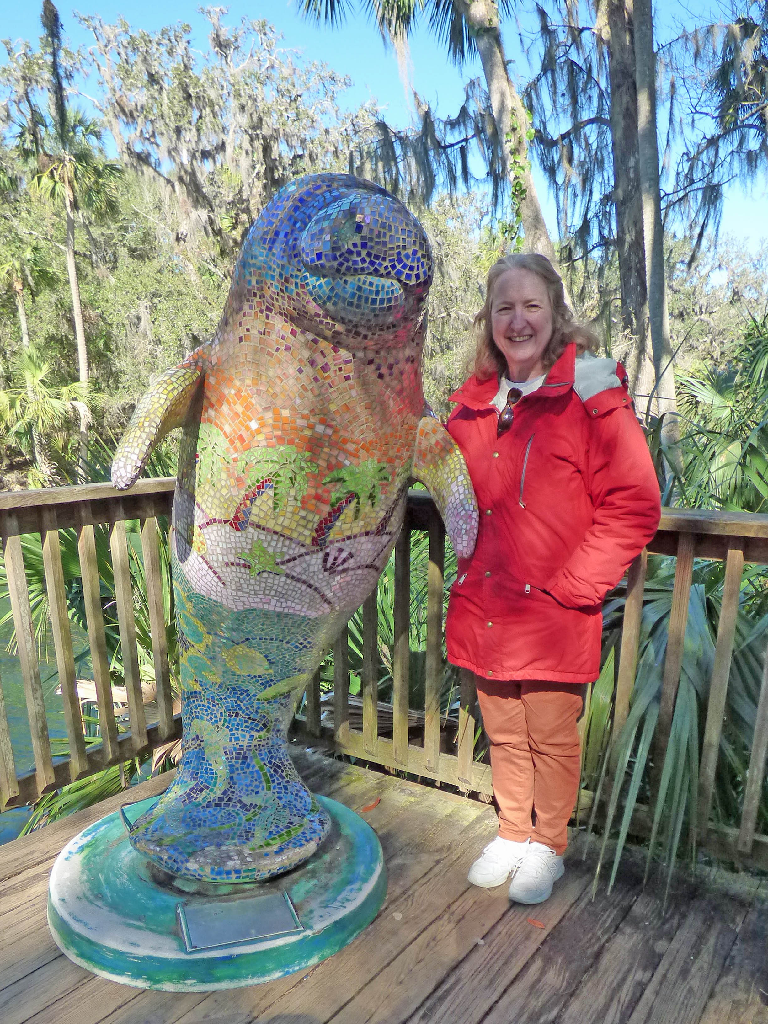 Of course, we had to get the picture with the manatee statue. Note, it was a warmer day but still required a parka. In Florida. Barbara was offended by the weather greeting she got.