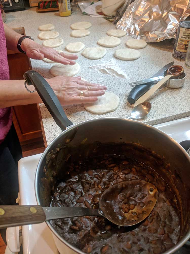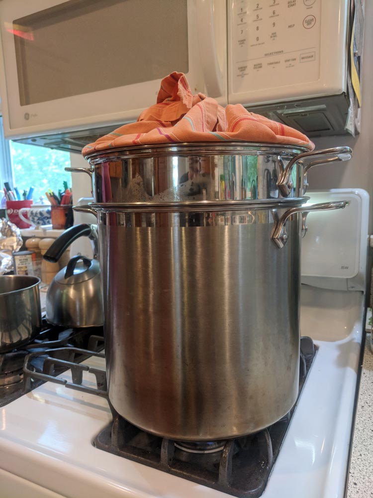 Jennifer and I were busy making Korean steamed buns. This, in the foreground, is the pot of beans that we were turning into bean paste for the center of the buns. I spent a lot of time smooshing them with the back of the spoon.