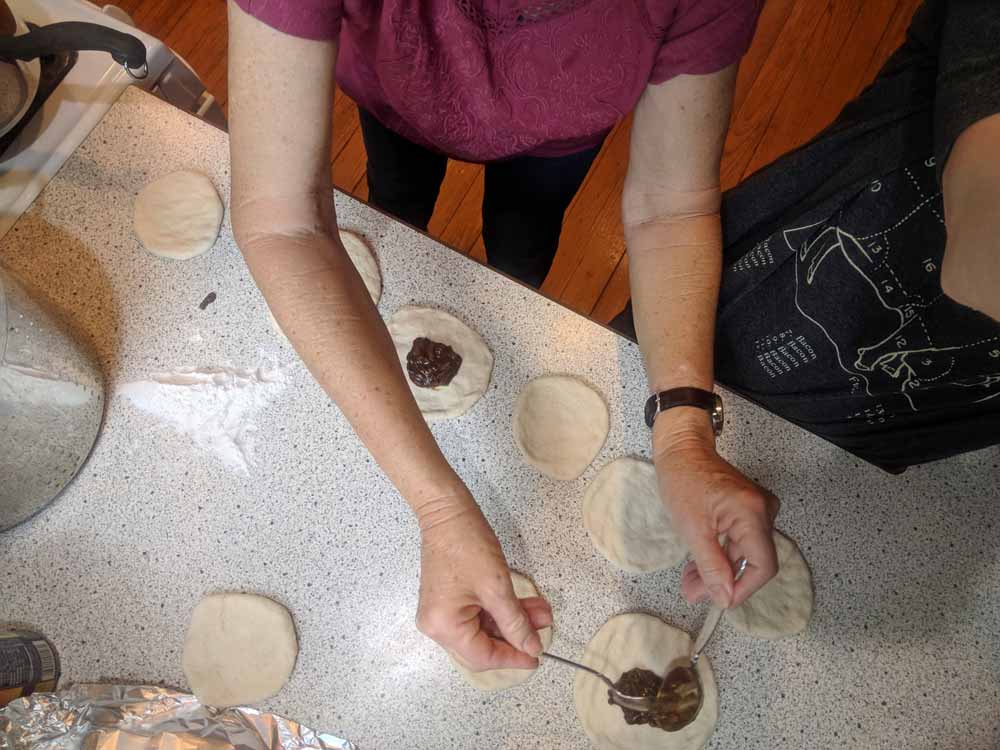 Jennifer was actually the chef, I was the sous chef. But, she kept stopping to take pictures of me working. I placed a heaping tablespoon of bean paste on each circle. I needed two spoons because the beans were very sticky – and sweet.