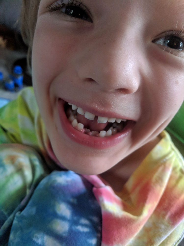 Six-year-old Owen hit a milestone this week. He lost his first tooth. And then, two days later, he lost a second tooth. Both of the adult teeth were well on their way in already. Owen told his Mama that he wanted to keep the teeth in a small container to show Papa when he got home. He didn’t think he really believed in the tooth fairy.